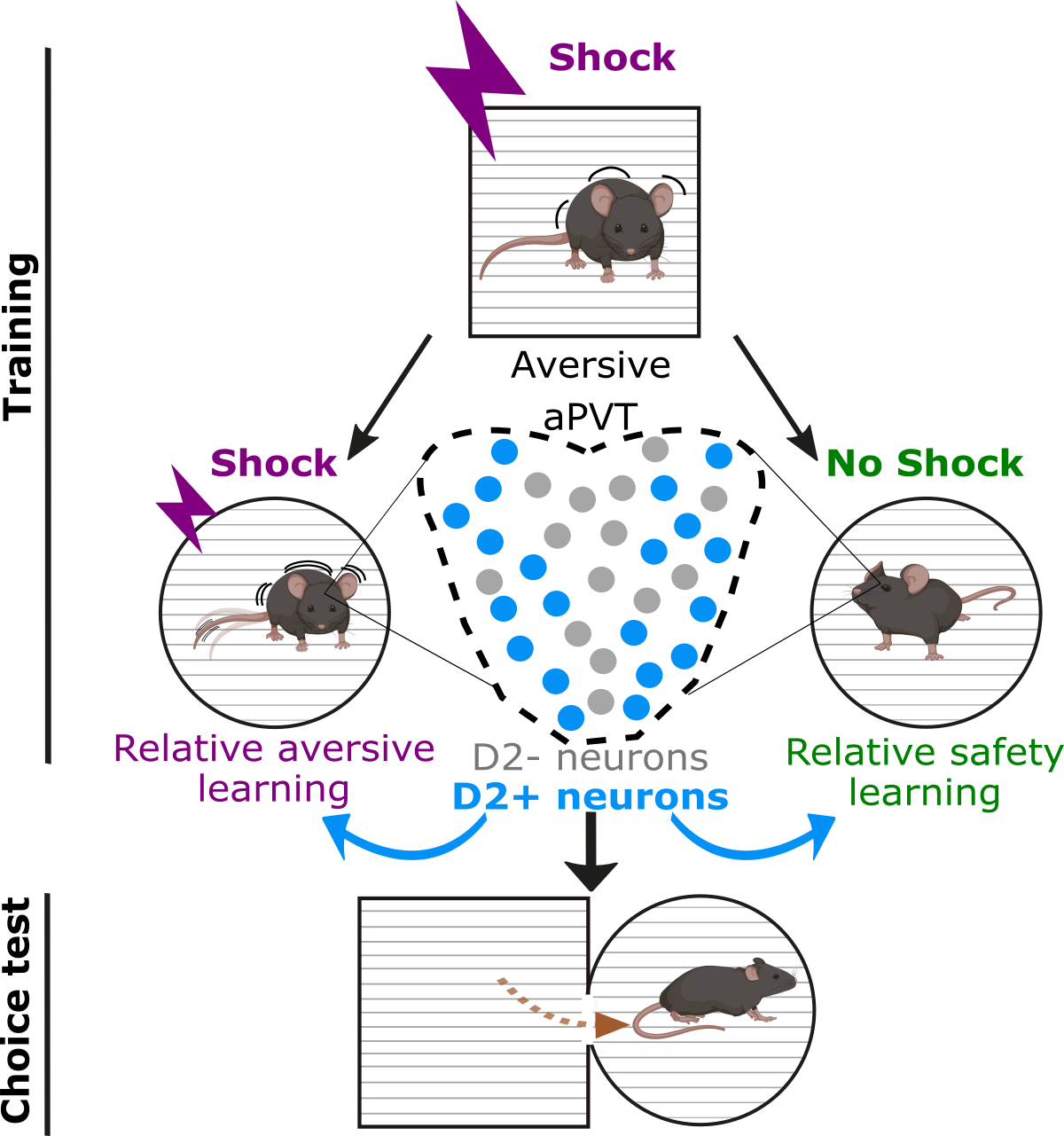 D2⁺, but not D2-, neurons of the anterior paraventricular nucleus of the thalamus are critical for learning relative aversive value and safety to select appropriate value-based choices and defensive behaviors.