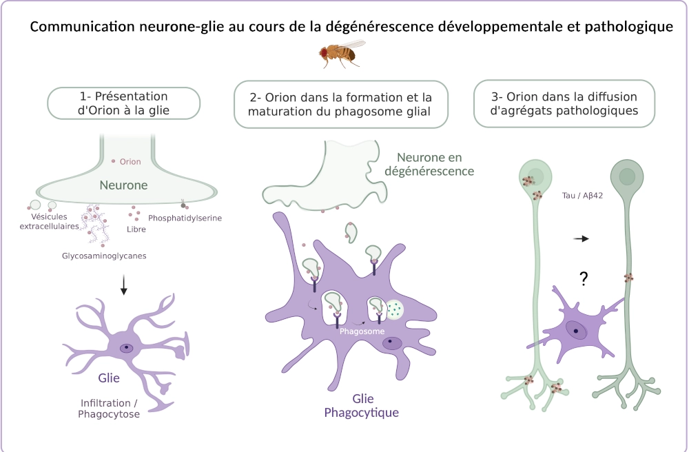 Orion, un signal de type chimiokine, marque les neurones en dégénérescence pour la phagocytose gliale. Le rôle d’Orion dans la propagation des agrégats de Tau / Aß42 sera étudié lors de la phagocytose gliale.